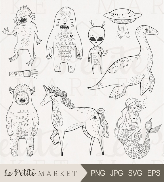 Hand Drawn Cryptozoology Clip Art Set Unicorn Clipart Loch Ness Monster Clipart Lagoon Monster Clip Art Hand Drawn Monster Illustration