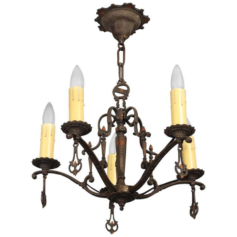 Cast Bronze Five Light Chandelier With Original Polychrome Paint