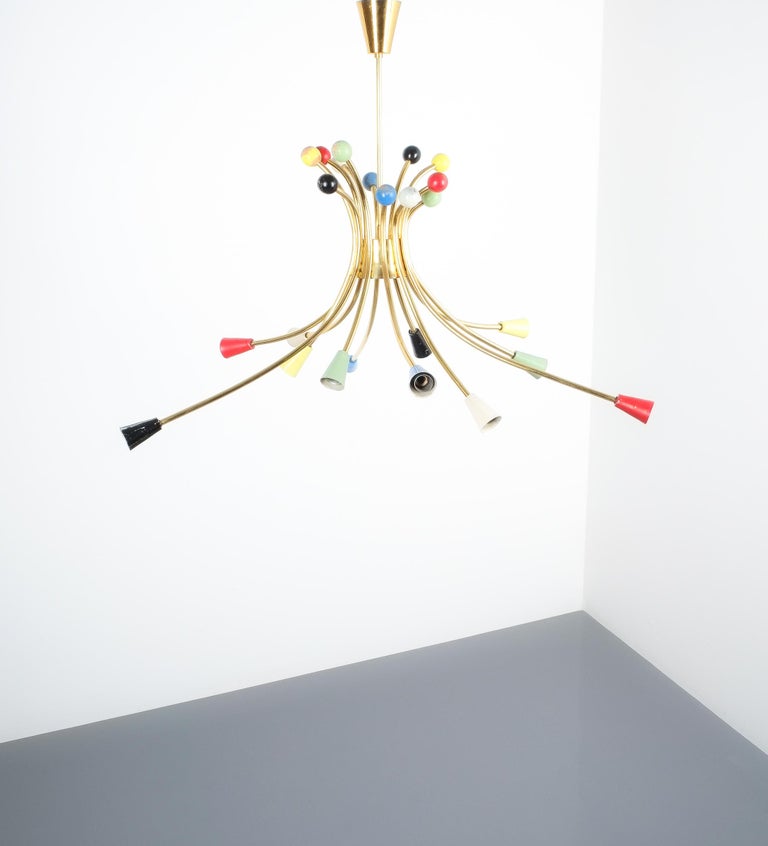 Refurbished Midcentury Sputnik Brass Multi Color Chandelier Italy 1950