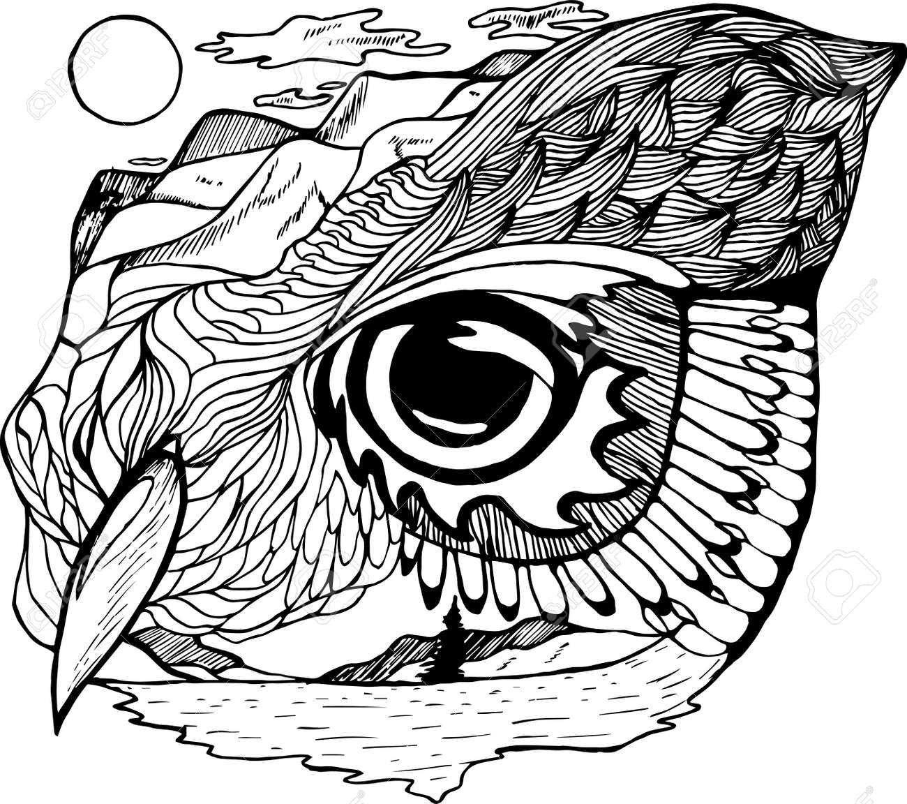 Black White Picture Of A Psychedellic Owl Nature Mountains