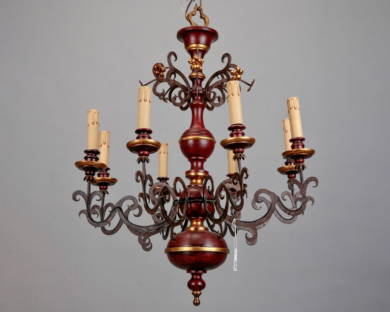 Italian Wood And Scrolled Iron Eight Light Chandelier 3645