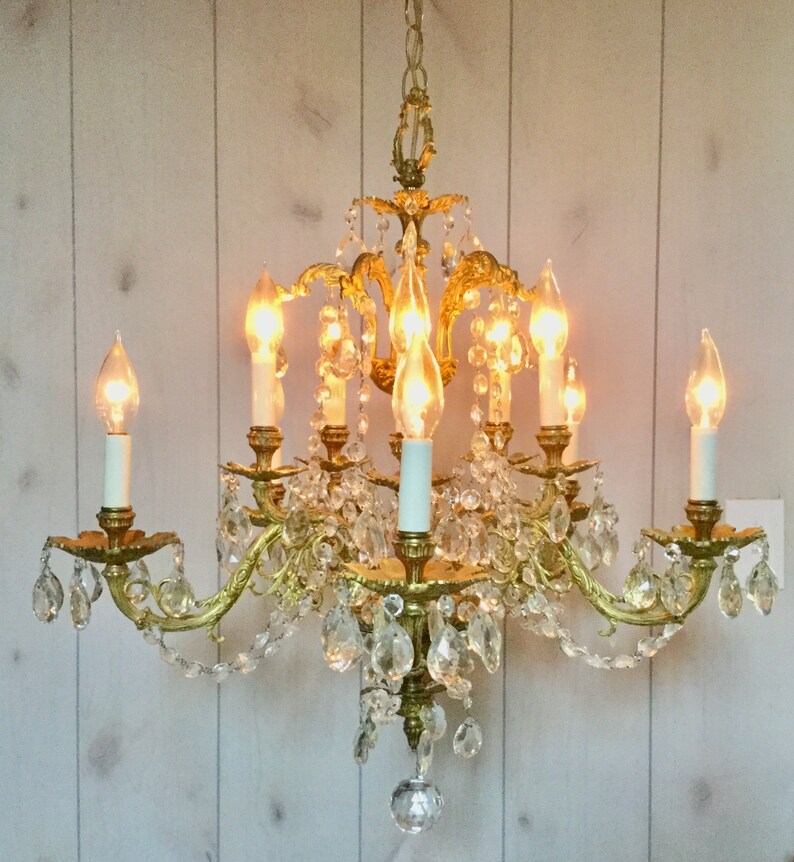 Huge Antique Crystal Chandelier Large 6 Arm 12 Light Made In Spain Solid Brass Crystal Prisms