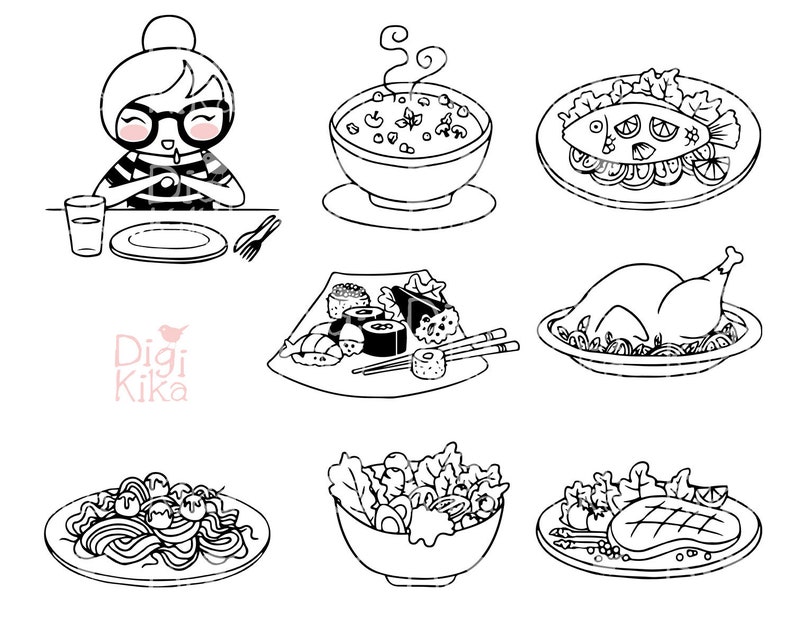 Planner Girl Food Dinner Lunch Clipart Digital Stamp Planner Stickers Scrapbook Card Design Invitations Paper Crafts