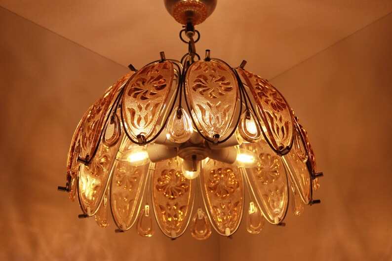Crystal Faceted Glass Chandelier Lighting Mid Century Ceiling Hanging Fixture Pendant Lamp Amber Burnt Orange Weding Decor Kinkeldey Style