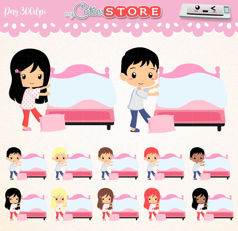 Cute Girl And Boy Making Bed In Pajama Change Sheets Set Great For Scraps Planner Stickers Digital Planning Personal And Commercial Use