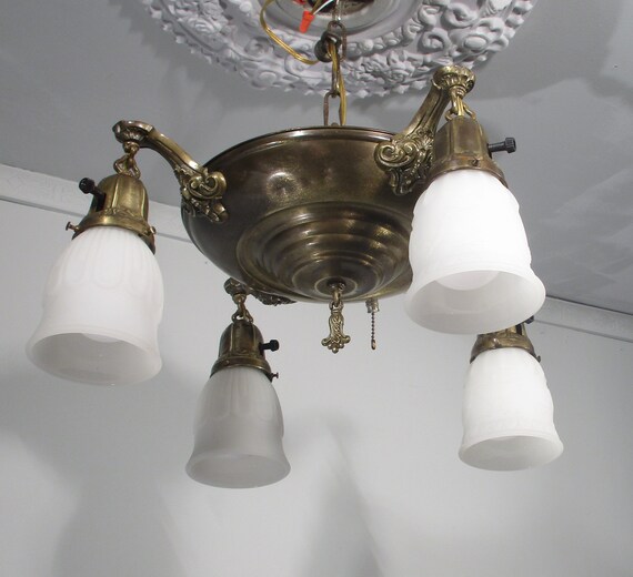 Antique Vintage Chandelier Brass 4 Light Pan With Opaque White Glass Shades