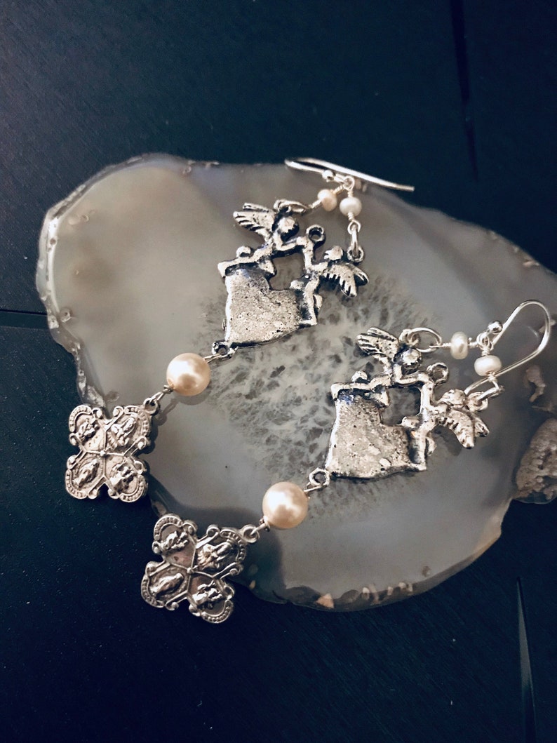 Mexican Chandeliers Earrings Pearl Chandelier Earrings Querubines Angel Sacred Heart Earrings Mexican 3 Way Cross Earrings Statement Exvotos