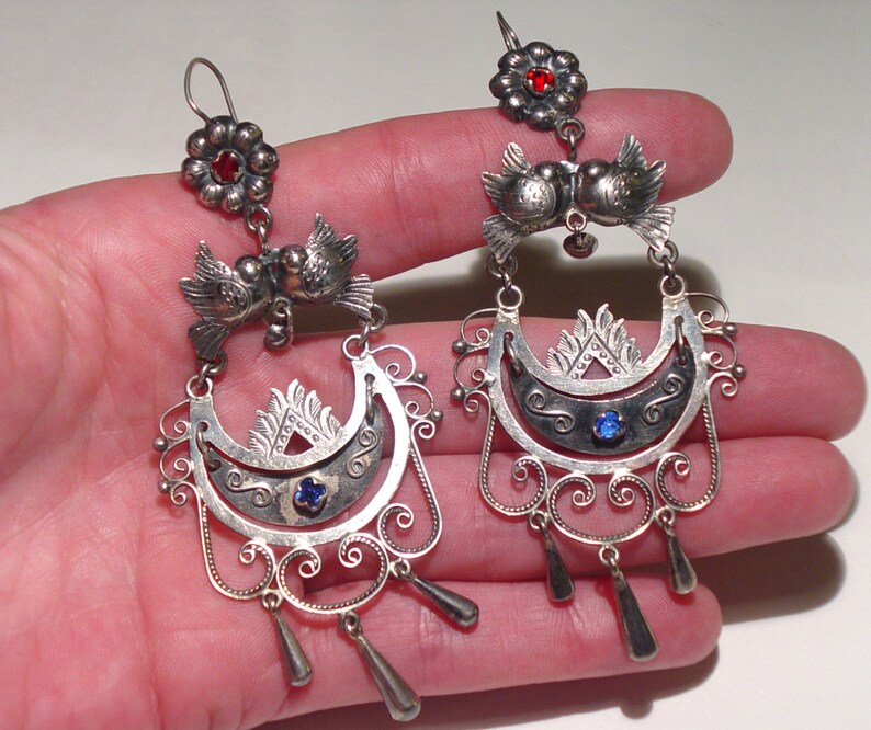 Huge 3 3 4 Mexican Sterling Silver Repousse Love Bird Girandole Chandelier Earrings