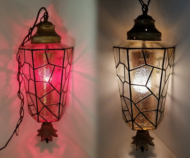 Vintage Swag Lamp Hanging Ceiling Chandelier Clear Stained Glass Mid Cent Modern